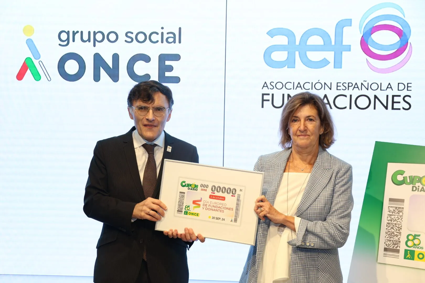 El vicepresidente 1º del Consejo General de la ONCE, Alberto Durán y la presidenta de la Asociación Española de Fundaciones (AEF), Pilar García Ceballos-Zúñiga, han presentado este miércoles, en el Orange Digital Center (Fundación Orange), el cupón que la ONCE dedica al Día Europeo de Fundaciones y Donantes, una iniciativa promovida por Philea (Philanthropy Europe Association), que la AEF impulsa en España cada 1 de octubre, reconociendo así el gran valor del sector fundacional y de la Filantropía en España y en Europa.
