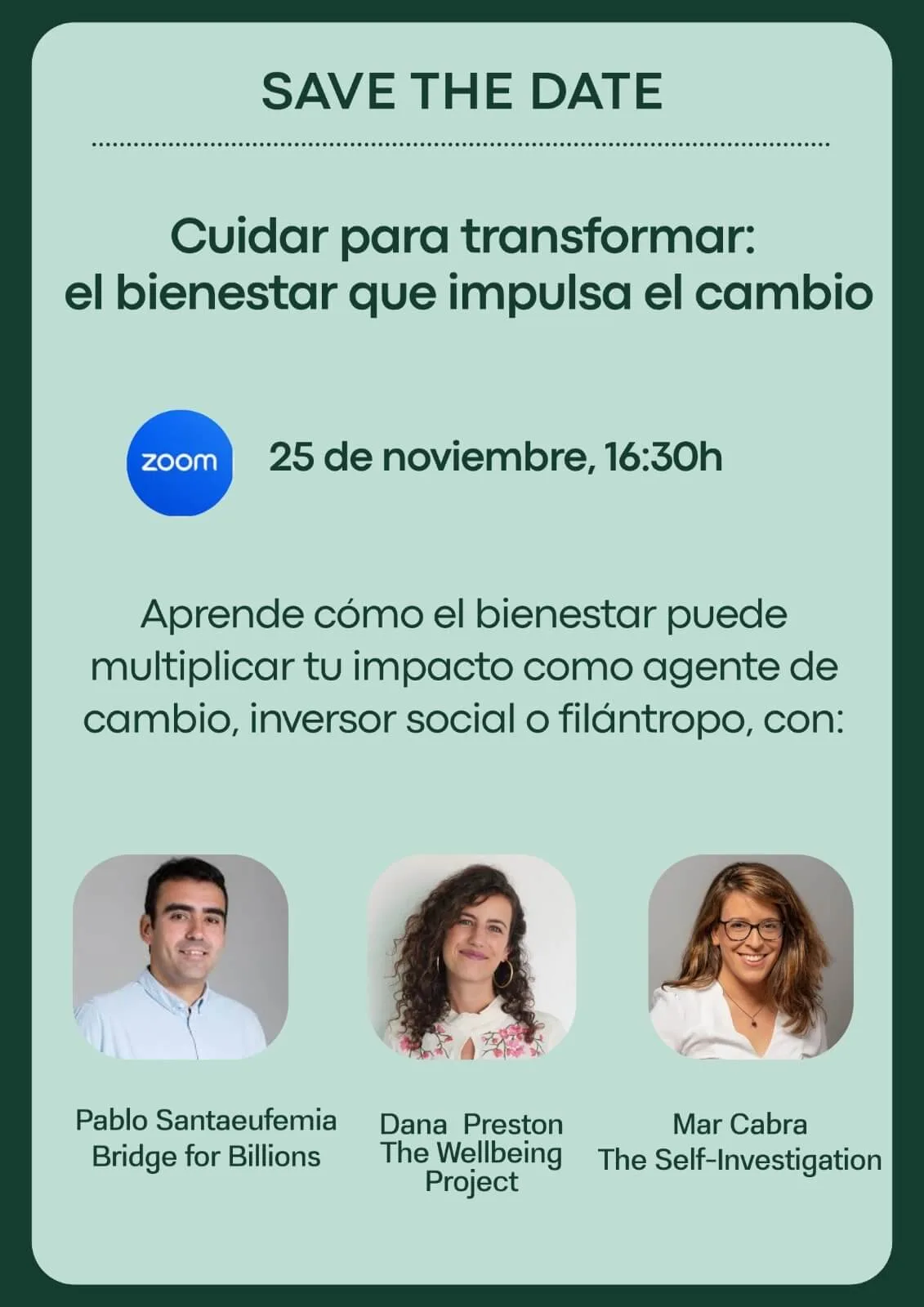 A través de casos prácticos, testimonios inspiradores y diálogo abierto, exploraremos este tema junto a Dana Preston (The Wellbeing Project), Pablo Santaeufemia (Bridge for Billions) y Mar Cabra (The Self-Investigation).Regístrate gratis aquí.